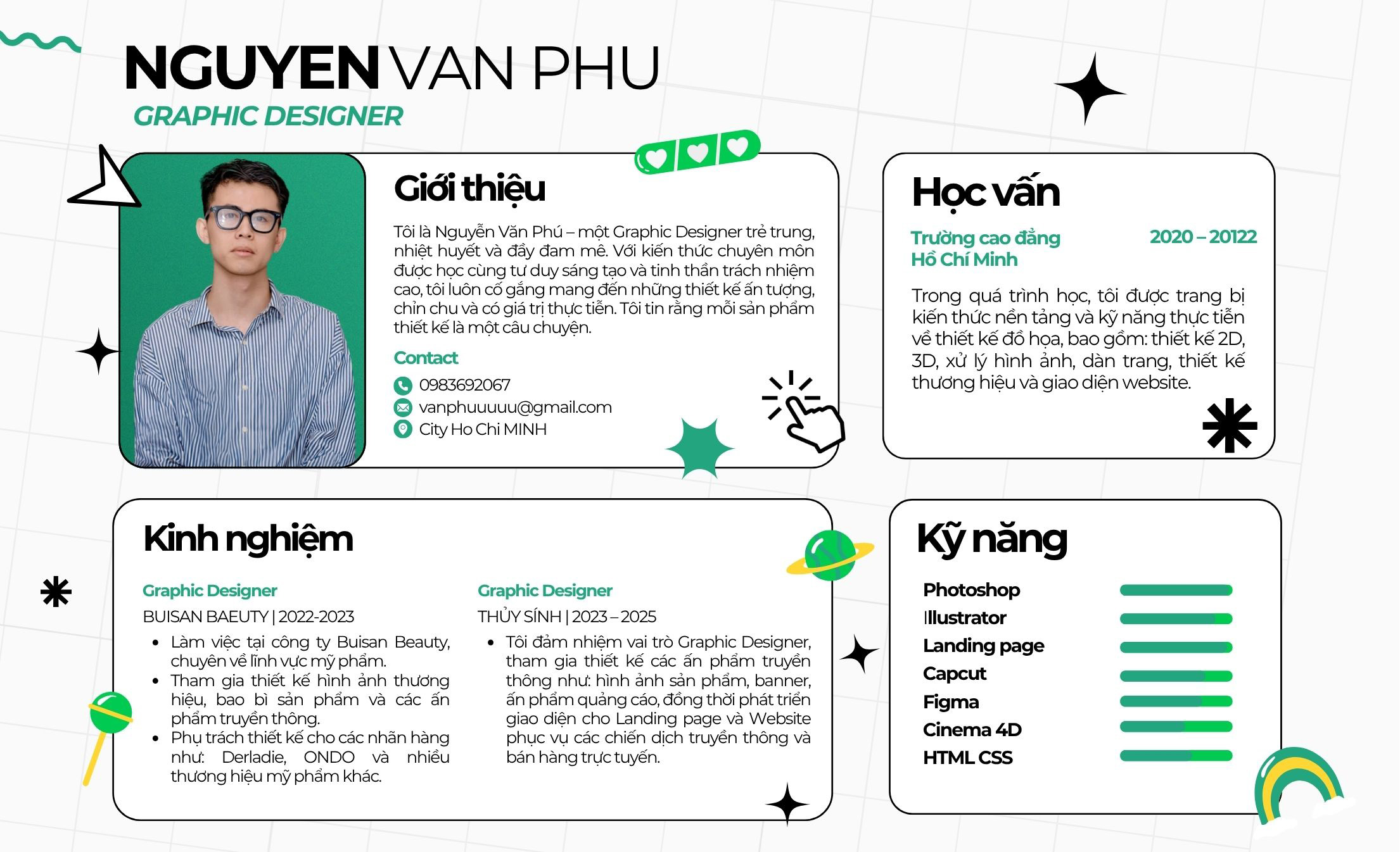 Với tinh thần học hỏi không ngừng, tôi luôn muốn mang đến những giá trị thiết kế thực tiễn, ấn tượng và mang dấu ấn cá nhân.
